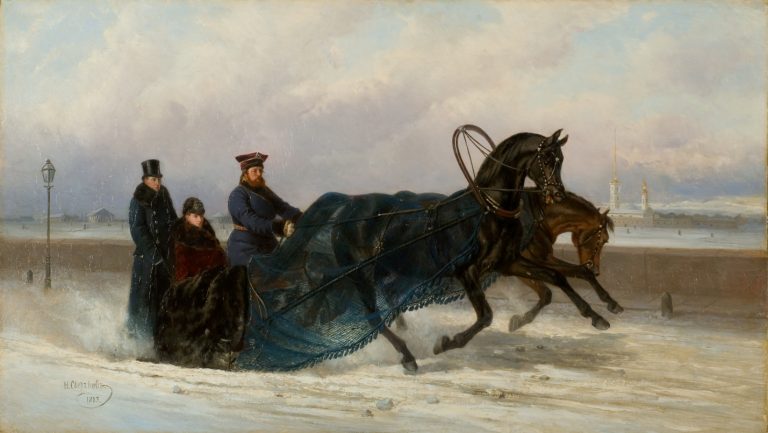 Среди немногочисленных изображений царственных особ, находящихся в музее коневодства, есть императрица Мария Фёдоровна, запечатленная знаменитым художником Сверчковым во время ее поездки в санях, запряженных парой лошадей, по набережной реки Невы в Петербурге. На его картине мы увидим сначала роскошных лошадей царского выезда, затем величественного кучера, и только потом за его могучей спиной маленькую фигурку императрицы. Николай Егорович остается верным своему призванию конного портретиста – сначала лошадь, а затем уже человек.