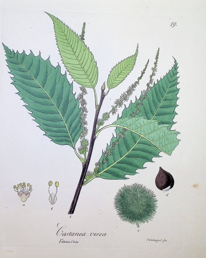 Настоящие каштаны составляют род Каштан (Castanea), входят в семейство Буковые (Fagaceae) и являются ближайшими родственниками привычных нам Дубов (Quercus) – на замечательной ботанической иллюстрации приведен один из видов рода Castanea: сходства действительно есть. Именно настоящие каштаны употребляются в пищу и являются одними из старейших культивируемых плодовых деревьев. К слову, ближайшими родственниками Конских каштанов являются… Клёны (Acer).