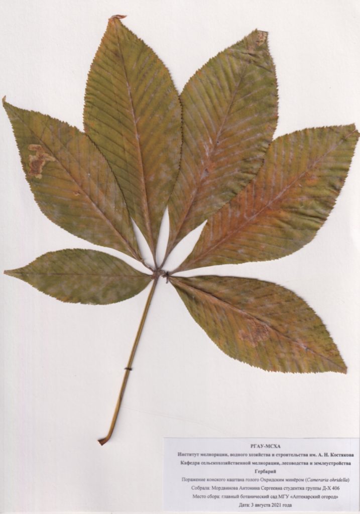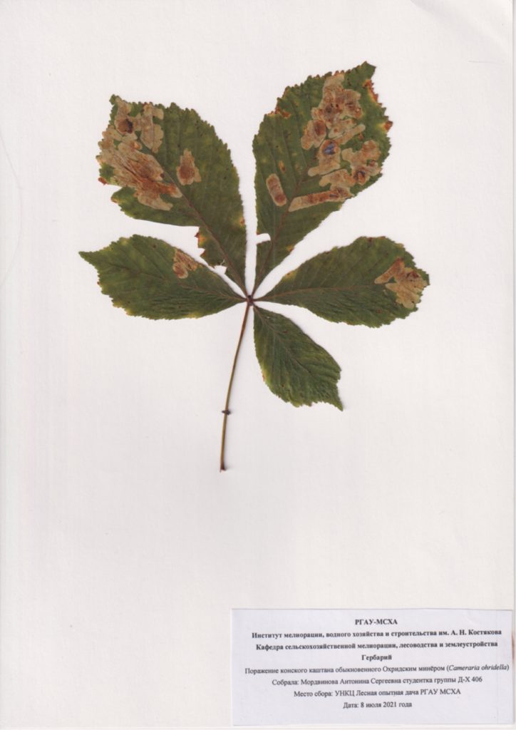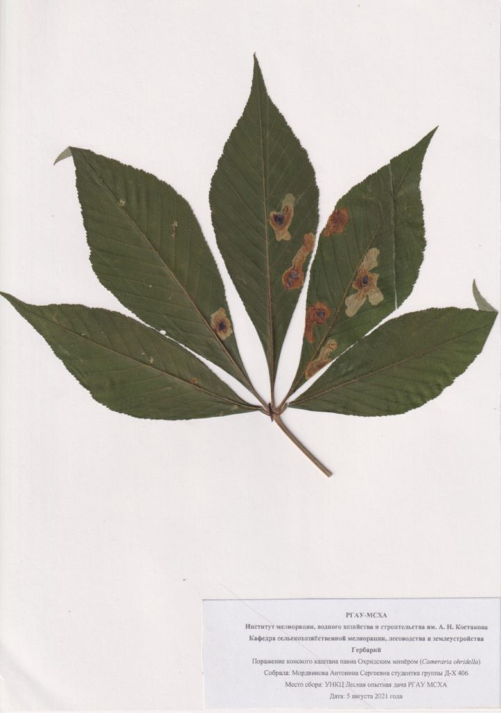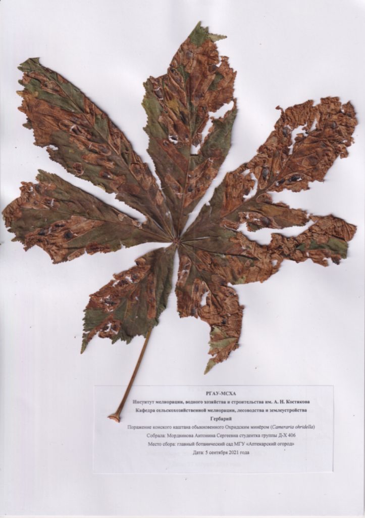 В задачи естественно-научных музеев входит не только хранение музейных предметов, но и образовательно-просветительская функция, для осуществления которой мы бережно сохраняем самые разнообразные биологические образцы. В коллекции «Болезни и вредители древесных растений» Музея леса хранится множество энтомологических и микологических экспонатов, а с этого года и некоторые гербарные образцы, собранные своими руками и полученные в дар от студентов-лесоводов. Вот так запечатлены повреждения конских каштанов в гербарных материалах выпускницы кафедры землеустройства и лесоводства, переданных в Музей леса. На гербарных листах запечатлены повреждения различных видов конского каштана.