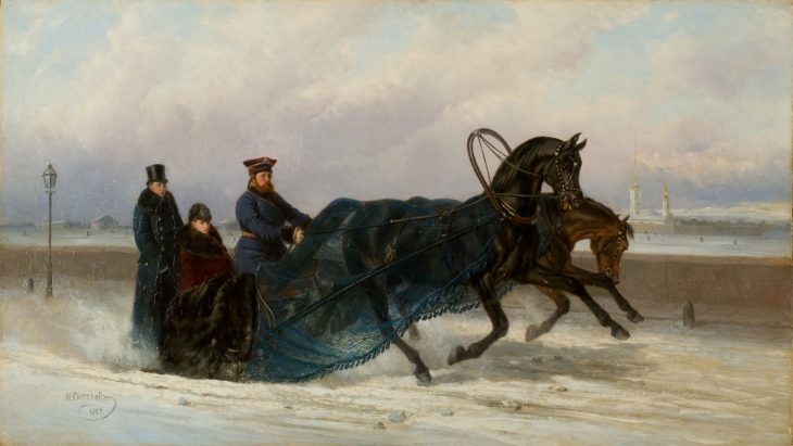 Сверчков Н.Е. «Императрица Мария Фёдоровна в санях», 1883 г., х., м., 70х124,7см